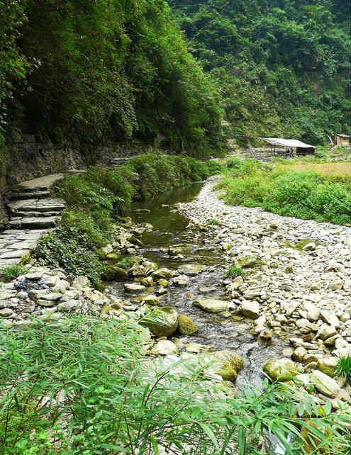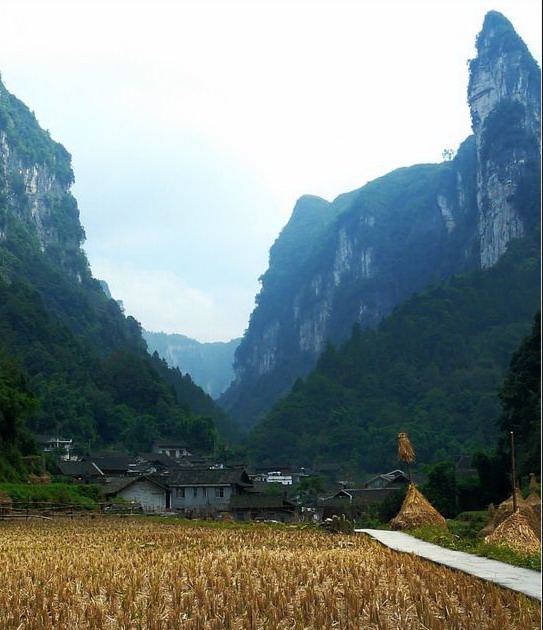 村寨四周山勢(shì)雄奇,絕壁夾天;“夯峽”、“九龍”、“玉泉”三溪在這里相會(huì),如同三根彩帶在這里相交結(jié)。這里是風(fēng)景區(qū)的中心,一萬五千多米長(zhǎng)的青石板路從這里一直通向各個(gè)景點(diǎn)這里還是一個(gè)角度十分好的觀景臺(tái),人立于此,只要原地轉(zhuǎn)動(dòng)身子,就可觀賞到東西南北全方位的各個(gè)景點(diǎn),那含情脈脈的“相依巖”、昂首奮蹄的“駟馬峰”、惟妙惟肖的“孔雀開屏”五彩繽紛的“彩云壁”和“畫屏峰”……盡在眼中無不景象萬千,令人目不瑕接。詩人石元機(jī)贊曰:
