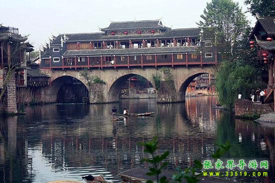 沱江河是古城鳳凰的母親河,她依著城墻緩緩流淌,世世代代哺育著古城兒女。坐上烏蓬船,聽著艄公的號(hào)子,看著兩岸已有百年歷史的土家吊腳樓,別有一番韻味。順?biāo)?,穿過虹橋一幅江南水鄉(xiāng)的畫卷便展現(xiàn)于眼前:萬壽宮、萬名塔、奪翠樓……一種遠(yuǎn)離塵世的感覺悠然而生。沱江的南岸是古城墻,用紫紅沙石砌成,典雅不失雄偉。城墻有東、北兩座城樓,久經(jīng)滄桑,依然壯觀。