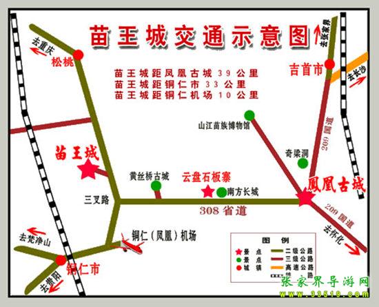 2、銅仁方向:自銅仁火車站往湖南方向經(jīng)過銅仁鳳凰飛機(jī)場附近(20公里處)、三岔路(23公里處)、蔬菜基地百合基地(26公里處)、中國苗王城牌樓(30公里處)、苗王茶園(30公里處)、苗王城生態(tài)農(nóng)業(yè)觀光點(桃林、金果林)、苗王城停車場售票處(33公里處)。