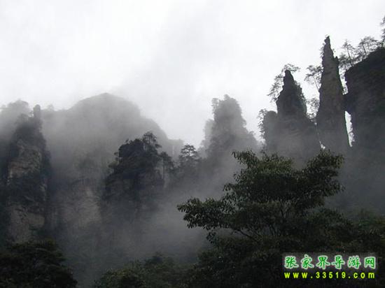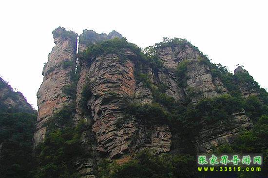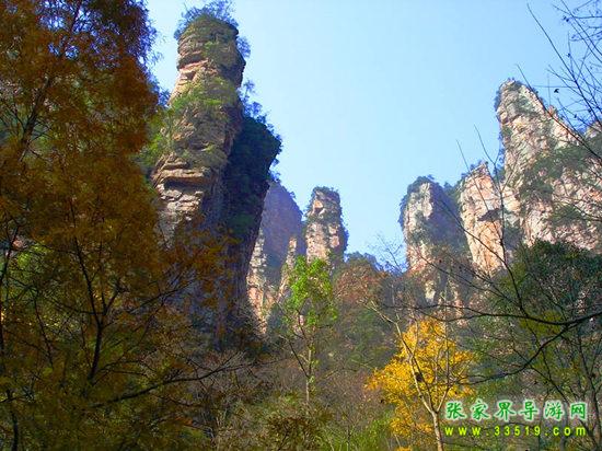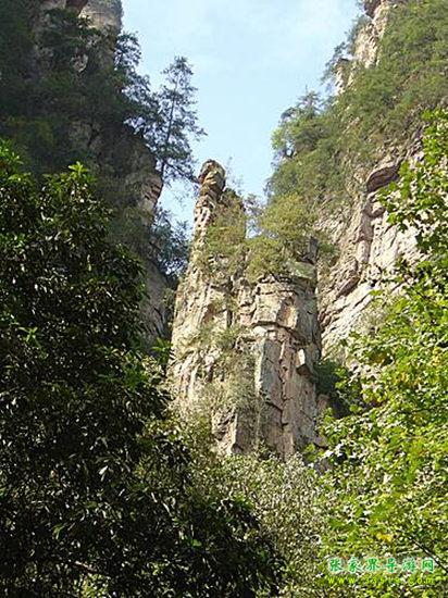 山谷中并排而立的三支山峰,有模有樣,有人叫他們“師徒取經”,說那是唐僧、孫悟空、沙和尚三人的“合影”??催^《西游記》的朋友,可能對這片風景有似曾相識的感覺,這兒曾是中央電視臺拍攝《西游記》的外景地。有些客人經常問,重要人物豬八戒先生怎么沒有趕上這個“合影”呢?他忙里偷閑,在后面背媳婦去了(我們剛才不是看過“豬八戒背媳婦”那個景點嗎?)不小心誤了時辰。如此看來,愛情和事業(yè)有時難免會有點矛盾。