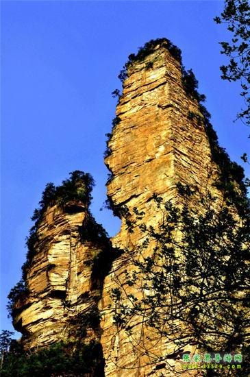 有緣千里來相會,萬水千山總是情。“曾經滄海難為水,除卻巫山不是云。”前方這支高300多米的石峰,是不是很像一對情侶?男的身材高大,頭戴頭盔,身披鎧甲,右手摟著女人的腰,左手撫著女人的肩膀。女的身材豐滿,面容清秀,兩眼深情地凝望著自己的愛人。兩人含情脈脈、情意綿綿的樣子好像有千言萬語三天三夜也說不完。您猜猜看,他們是在互相傾訴離別的痛苦呢,還是在相互表達重逢的喜悅?有詩人這樣寫道:“半是愛憐半是悲,少從軍伍老方回。糟糠啜泣將軍淚,化作春風滿谷吹。”相傳這男的是明代抗倭時一位土家族將軍,一打完仗就千里迢迢,風塵仆仆地趕回來和愛人相會。他連頭盔和鎧甲都沒來得及換!這女的自從和心愛的情人離別后,朝思暮想,茶飯不思,“衣帶漸寬終不悔,為伊消得人憔悴”。她清秀的臉上仍顯得有幾分憔悴,卻格外楚楚動人!此情此景,您看到了嗎?您看到的是石頭,還是愛情?山風吹在石壁上的聲音和著金鞭溪的流水聲,好像一聲聲祝福:祝您愛情美滿!愿天下有情人終成眷屬!