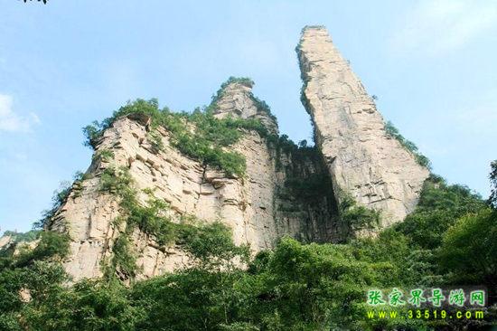 說到討好老婆,豬八戒可謂這方面的專家。您回頭看,不遠處一支長有一些小樹的石峰,頂部分了丫,像一個英文字母“Y”,很像頭戴綠色小帽的豬八戒背著他身材嬌小的老婆(有人開玩笑說他戴的是“綠帽子”,背的是“小老婆”)。小老婆撐著一把小陽傘,還正在背上一扭一扭的呢!八戒的嘴最形象,嘟得老長,好像背了很久,累得不行了,正喘著粗氣——您千萬可別看不起豬八戒先生,他魅力足著呢,他不但能吃會玩、開朗大方,而且溫柔多情,雖說長相“安全”了一點,但特別擅長哄女孩子開心,不少窈窕淑女就喜歡他這種“好逑的君子”。