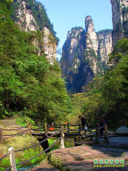 金鞭溪因流經金鞭巖而得名,全長5700米,穿行於絕壁奇峰之間,溪谷有繁茂的植被,溪水四季清澈,被稱為“山水畫廊”、“人間仙境”。有詩贊曰:“清清流水青青山,山如畫屏人如仙,仙人若在畫中走,一步一望一重天”。途中你會看到點歌臺,那里有土家姑娘時刻準備為游人唱民族歌曲,只要付十元錢她們就會為你引吭高歌,當然,如果你不想花這個錢,也可以在一邊聽聽別人點的歌,聽完后走人。