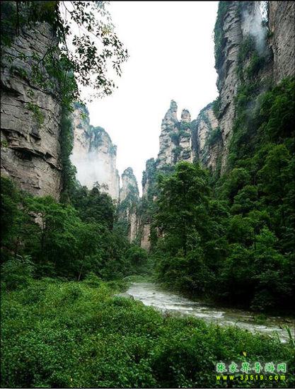 金鞭溪穿行于深壑幽谷之間,溪的兩邊千峰聳立,高入云天,樹木繁茂,濃蔭蔽日,這兒溪水潺潺、琉璃飛瀑,奇花異草與珍禽異獸同生共榮,構成極為秀麗、清幽、自然的生態(tài)環(huán)境,被稱為“世界最美的峽谷”,“最富有詩意的溪流”。
