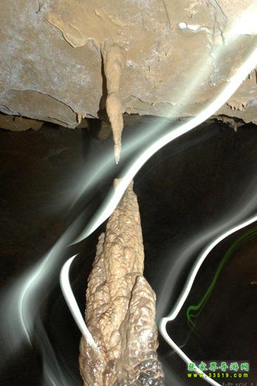 在這兒向您介紹一點(diǎn)溶洞學(xué)的知識(shí)。在溶洞中,自洞頂往下生長(zhǎng)的叫石鐘乳,自洞底往上生長(zhǎng)的叫石筍,兩者相向生長(zhǎng)連在一起就叫石柱,三者統(tǒng)稱(chēng)為鐘乳石。這兒有一根石鐘乳與一根石筍是相對(duì)生長(zhǎng)的,差一點(diǎn)點(diǎn)就要連起來(lái)了,但他們卻永遠(yuǎn)不能合在一起,因?yàn)樯厦娴氖娙橐呀?jīng)沒(méi)有滴水,已經(jīng)失去了生命力。這好像一對(duì)苦苦守望的情人,近在咫尺,卻永遠(yuǎn)不能相逢。于是人們便給他們?nèi)×艘粋€(gè)非常動(dòng)人的名字——恨難逢。“盈盈一水間,脈脈不得語(yǔ)。”“天涯海角有窮時(shí),只有相思無(wú)盡處。”在無(wú)數(shù)個(gè)春去秋來(lái)的日子里,他們?cè)撚卸嗌匐x愁別緒??!——真不知道是石頭多情,還是人多情?——而有的人說(shuō)得很樂(lè)觀,“兩情若是長(zhǎng)久時(shí),又豈在朝朝暮暮”,所謂“距離產(chǎn)生美”嘛。