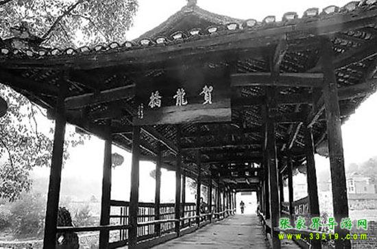 賀龍橋原稱“永安橋”。飛架于賀龍故居右側(cè)玉泉河上,是一座石墩、木粱、騎廊的風(fēng)花橋。東西長40米、寬7米、高8米。龍爪翹檐,中聳堡亭,8尊石獅,分置橋頭及石墩之上,造型渾厚古樸,富有民族特色。此橋原是溝通桑植內(nèi)外半縣的必經(jīng)之道,是上川鄂下津澧的要津,也是當(dāng)年鹽局奪槍、桑植起義的發(fā)端處。系賀龍?jiān)娓纲R廷宰首倡捐資修建,幾番修而復(fù)圮。至1916年,終由賀龍父親賀仕道襄修告竣。1929年冬,桑植“剿共”司令陳策勛,謂以破“賀氏風(fēng)水”,令毀此橋。解放后,桑植縣人民政府于1952年冬按原樣復(fù)修,命名“賀龍橋”。“文化大革命”動亂中,林彪、“四人幫”誣陷賀龍,指使“紅衛(wèi)兵”毀橋,群眾奮起護(hù)衛(wèi),才幸免劫難。1983年5月,賀帥女兒賀曉明應(yīng)縣政府請求,得全國書法家協(xié)會秘書長謝德萍書匾“賀龍橋”,高懸橋之東西首,永志紀(jì)念。1978年,賀龍故居及其生平業(yè)績陳列室、賀龍橋,列為省級重點(diǎn)文物保護(hù)單位。凡到賀龍故居、賀龍紀(jì)念館的游客這是必經(jīng)之地。