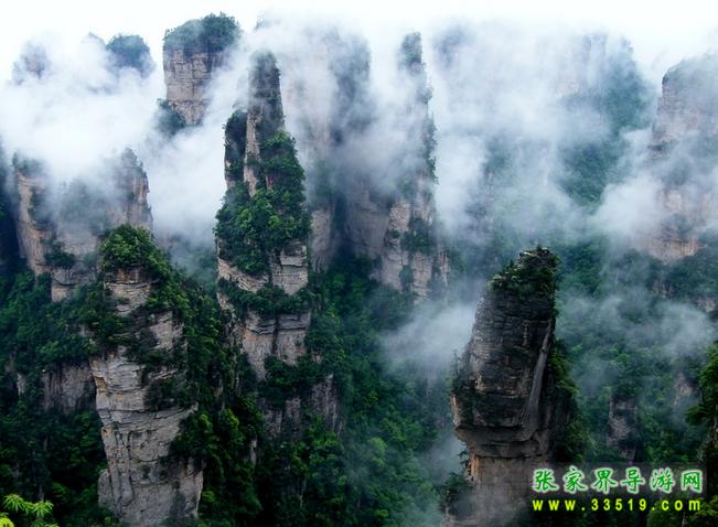 自“百龍電梯”西行五公里至中坪停車場,向南步行200米許,一石門天然洞開,渾圓如月。門西側(cè)絕壁上有一凹臺(tái),頭頂危巖,下臨深淵,長20多米,平均寬1.5米。幽谷中林木繁茂,芳草叢生,數(shù)十座玲瓏剔透的石峰爭奇斗巧,顯得無限深邃,無限幽遠(yuǎn)。石峰由低漸次升高,色彩由深到淺,由明變暗,形成十多個(gè)層次與灰黑色的朝天觀相連,遠(yuǎn)處還有迷蒙的群山。陽光直射幽谷時(shí),石峰獨(dú)立顯形,輝綠映丹,構(gòu)成一幅意境超然,氣勢(shì)磅礴,色彩清新的畫卷。雨天則云霧如海,峰林飄搖,似幻非幻。