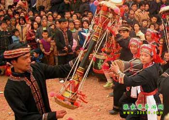 仗鼓舞是白族的一種獨(dú)特舞蹈,尤其是張家界天子山一帶的白族人,大都愛跳仗鼓舞。逢年過節(jié)、游神、趕會,山山寨寨都要舉行歡樂的“跳舞節(jié)”。仗鼓舞根據(jù)人數(shù)多少,分為4人舞、8人舞、32人舞等多種形式,主要道具是仗鼓,鼓長1.2米,兩頭粗,中間細(xì),因兩頭緊繃牛皮,敲擊時便“嘭嘭”作響。跳舞前須祭祀祖先,然后由三位德高望重的老者先入場引導(dǎo)圍圈歡跳,擺呵、蹬呵、拍呵,繞著場子一圈又一圈地跳,鼓聲陣陣,還有嗩吶、笛子等樂器伴奏,舞姿靈活多變,古樸大方,驚險敏捷,民族色彩濃郁。
