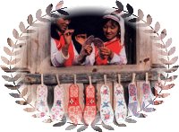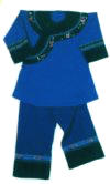 據(jù)史載,有關(guān)土家族的服飾宋代稱(chēng)“溪布”、“峒布”、“土錦”等。后受漢族先進(jìn)技術(shù)影響,土家人用自織自染的“土布”做成圍裙。到現(xiàn)代,土家服飾發(fā)生了巨大變化,但仍保留了許多傳統(tǒng)樣式。土家族人始終著以琵琶襟為特征的滿襟衣。托肩矮領(lǐng)大袖口,滾花邊。男捆腰帶,女套繡花圍裙。頭上均包青布帕或絲帕,男帕左方垂一節(jié)過(guò)耳,婦女全包頭。未婚閨女留長(zhǎng)發(fā)扎辮,用紅頭繩扎上下兩端,額前前留“劉海”。已婚婦女挽上發(fā)管,別簪,插銀首飾。褲子多為青、藍(lán)色、上結(jié)白布褲腰,褲腳短且大。青壯年男子打綁腿,女褲以對(duì)襯色布加邊,上綴三條均等的梅花條,腳上穿青布瓦鞋,包白色裹腳布。若遇喜慶節(jié)日或走親訪友,則另有一番梳妝打扮,如加佩牙簽、銀牌等。