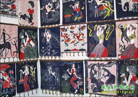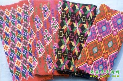 織錦。又名“西蘭卡普”、“土花鋪蓋”,為土家族傳統(tǒng)工藝品之一,是森林公園工藝品廠的主要產(chǎn)品??楀\是在特制的本質(zhì)織機上以錦紗為經(jīng)、五彩絲線為緯、手工提花織成。以其質(zhì)地厚實、堅韌,色彩鮮艷,格調(diào)古樸,流暢生動著稱。圖案有花草、鳥獸、生產(chǎn)、生活、幾何、字樣等種類。為舊時土家姑娘必備嫁妝之一。據(jù)考證,早在漢代,土家織錦就作為方物貢入漢室宮廷。20世紀后,土家織錦曾漂洋過海至日、美、英等國展出,并作為禮品,被國家領(lǐng)導(dǎo)人贈送給外國元首及政府官員,如今織錦以壁掛、枕巾、沙發(fā)墊、桌圍、提袋、服飾等多種式樣遠銷世界各地。