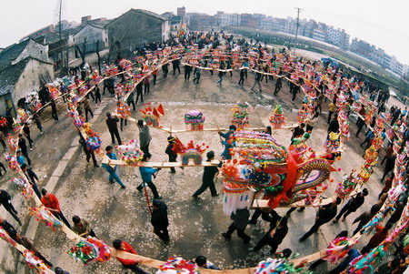 龍舞是中國民間體育藝術(shù)。大庸境內(nèi)的板凳龍是 別具一格的龍舞形式。尤其桑植縣白族人民,對舞板 凳龍有著特殊偏愛。 白族同胞耍板凳龍,相傳起于漢代,由白族先民 “舞龍求雨”的宗教活動演變而來。 板凳龍有兩種樣式。一種是簡式板凳龍,由二個 舉長凳為頭,一人在后選適當(dāng)“舞臺”表演;另一種 是“篾扎板凳龍”,即用竹篾扎成龍形置于板凳之上 ,以木腳示龍爪,造型美觀,逼真。耍板凳龍又分兩 種舞式,一為獨凳龍,一為九節(jié)龍(九張板凳相接)。 舞板凳龍動作有“二龍搶珠”、“黃龍穿花”、“二 龍戲水”、“金蟬脫殼”、“黃龍盤身”等。永順、 慈利還流行草把龍,其龍耳稻草扎成。龍舞還有“干 龍”、“濕龍”之分,“干龍”多為娛樂,“濕龍” 則為求雨。“龍”到之處,百姓必潑水助威,舞者一 身透濕,盛為熱烈歡快。