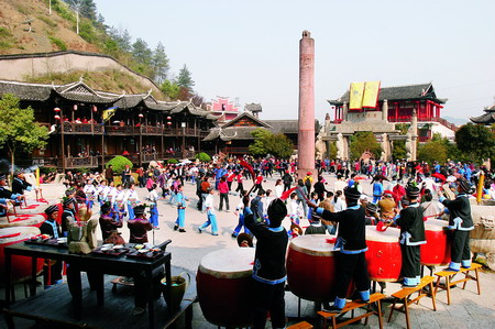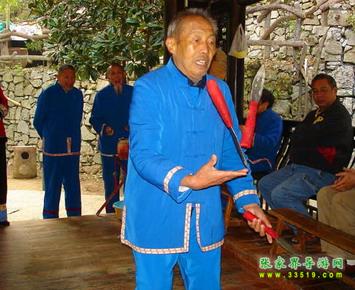 三棒鼓,唐代稱三仗鼓,明沈行符《顧曲雜言》 曰:“吳下何來有打三棒鼓乞錢者,余幼時有見之也, 起于唐咸通中(公元865年)”約于明代傳入本境, 并逐漸成為群眾增聞樂見的民間藝術(shù)形式。每年春節(jié) ,藝人們結(jié)伴走村竄寨拜年,表演對象不分貧富,戶 戶必到。如遇貧寒之家,表演者將別家贈送禮品相送 ,意在人人過節(jié)歡喜。充分體現(xiàn)出土家族人熱情好客 ,心地善良的民族性格,對加強民族團結(jié)有一定作用 。 三棒鼓通常由三至五人組成,一人擊鼓唱詞,一 人鑼鈸配樂,一人耍花棒?;ò羧?,長一尺,舞者 左右手各持一根,將另一根拋在空中,左右開弓,擊 打空中花棒使之不落地。也有以刀代棒,以五刀代三 棒的技藝。技藝高強者,突然把刀拋得極高,來一個 眼花繚亂,不禁稱絕。打三棒鼓,通常有“鬧春耕” 、“收割打場”、“慶豐收”、“拜年節(jié)”四套,分 “鯉魚跳龍門”、“玉女穿梭”、“板巖漂灘”等項 目。打三棒鼓技巧性強,表演時需高度集中,用力適 當(dāng),貫通一氣,并與演唱者默默配合。