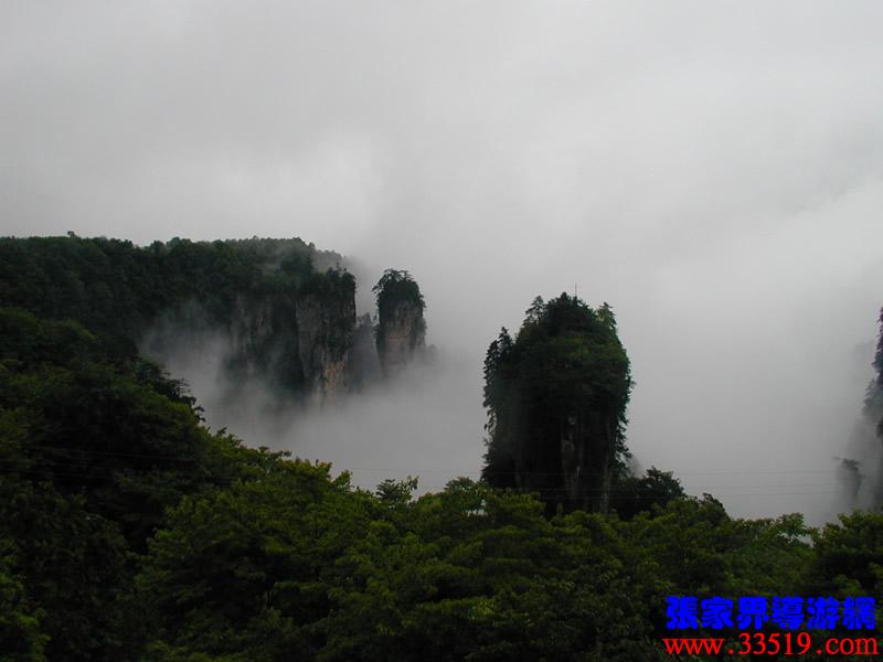 這里,我還給大家講個奇異現(xiàn)象。1991年4月的一天下午,雨過天晴,整個天子山漫開一片朦朦朧朧的薄霧,從西海到神堂灣一帶,一座座巖峰在霧中時隱時現(xiàn)。一群上海游客來到點將臺,忽然,一幅奇異的場景把大家驚呆了:神堂灣中央,七位少女從云霧中飄落到一座巖峰峰頂?shù)钠脚_上,飲茶、撫琴,翩翩起舞達(dá)40分鐘之久。游客們起初以為是一種幻覺,揉揉眼睛再看,仍然是三綠四紅,長發(fā)披肩,體態(tài)婀娜,舞步輕盈。直到“仙女們”隨一片云霧漸漸隱去的前一秒鐘,大家仍然不敢弄出半點聲響,有相機(jī)的就拼命按快門。遺憾的是距離太遠(yuǎn)了,當(dāng)晚將膠卷取去沖洗,什么也沒留下。消息傳開后,有人相信,有人不相信。其實,神話也好,事實也好。這種奇異現(xiàn)象完全可用科學(xué)去解釋。“海市蜃樓”這是人所共知的;而大沙漠中不也經(jīng)常出現(xiàn)綠洲、村莊、城市么?