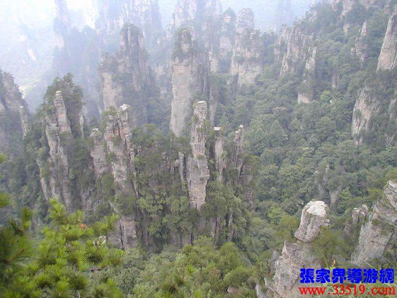 (大觀臺)這就是大觀臺。極目遠(yuǎn)眺,千百座奇峰盡收眼底。一位詩人說,武陵源的砂巖峰林是一步一觀景,千步千造型,一山有四季,十步不同天。專家測算出武陵源石峰有3103座。一如一位高超的雕塑大師,模擬宇宙萬物,無不形狀逼真,維妙維肖,栩栩如生,呼之欲動。有的如海螺出水,有的如金龜銜日,有的如蓮花盛開,有的如天橋橫空,有的如長槍刺天,有的如寶塔聳立,有的如老人采藥,有的如玉女梳妝,有的如將軍出征,有的如戰(zhàn)馬長嘯,有的如情人幽會,有的如夫妻相擁,有的如仙女散花,有的如村姑守望有的孤峰獨秀,有的直插云霄,有的婷婷玉立,有的威武勇猛,有的小巧玲瓏,有的大氣磅礴。進(jìn)入武陵源,但見一片峰的森林,峰的世界,峰的海洋。挺拔、奇秀、集中、原始、粗獷、古野。這就是武陵源。一位藝術(shù)大師說:武陵源的山峰,改寫了山的概念。大攝影家陳勃說:“三山五岳堪比美,華夏風(fēng)光每一流。”王繼杰先生說:“武陵源上三日游,勝讀千篇李杜詩。”許世杰先生說:“秀幽險峻稱奇絕,五岳黃山拜下風(fēng)。”李成瑞先生為此大抱不平:“神州勝景誰為最?須請霞公重評勘。”可惜徐霞客無緣到大觀臺來,也不可能為武陵源作甚評價了。