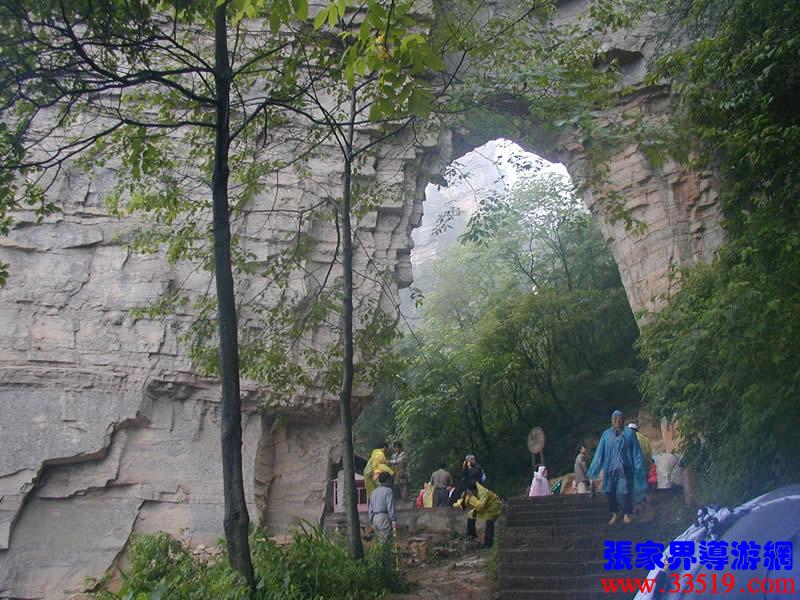 (南天門)大自然的造化真奇妙,利用一塊巨大的板狀石峰鑿出一扇大門,底寬10余米,高15米。相傳當(dāng)年屈原登天臺問天,就是從這里經(jīng)過的,故民間叫它“通天門”。據(jù)說向王天子在水繞四門苦練三年零六個月武藝,起事那天,就是立在這兒向皇宮連射三箭,流傳在武陵源民間的“三箭射皇宮”的典故就從此來。