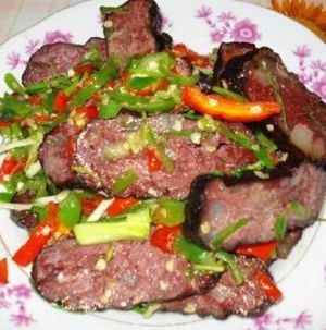 介紹: 血豆腐,就是將豆腐和豬血、豬肉及花椒、辣椒等佐料拌成泥狀,捋成卵形,以竹篩置火炕上,煙熏烤成臘黃,吃起來耐嚼味香,是土家特色菜,當?shù)厝顺R云湎戮啤?在張家界的飯館里很難吃到正宗的土家特色菜,可以去做土味的特色餐館去解解饞。但是最正宗還是鄉(xiāng)下人家家里自己熏的,那才叫一個好吃!?。?/p>