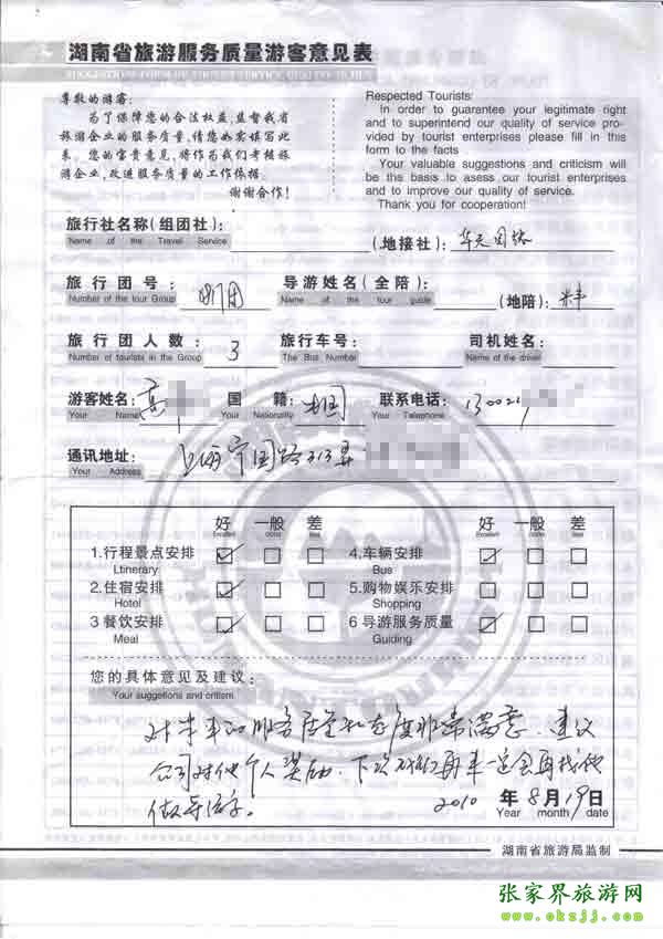 2010年8月19上海高先生一行位旅游質(zhì)量反饋:對(duì)導(dǎo)游非常滿意,行程安排都很好