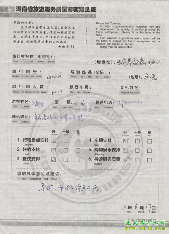 2009年6月25日福建邵先生一行12人接待質(zhì)量反饋單: