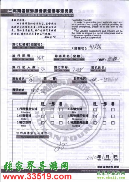 2010年6月17日黑龍江胡先生一行3位旅游質(zhì)量反饋