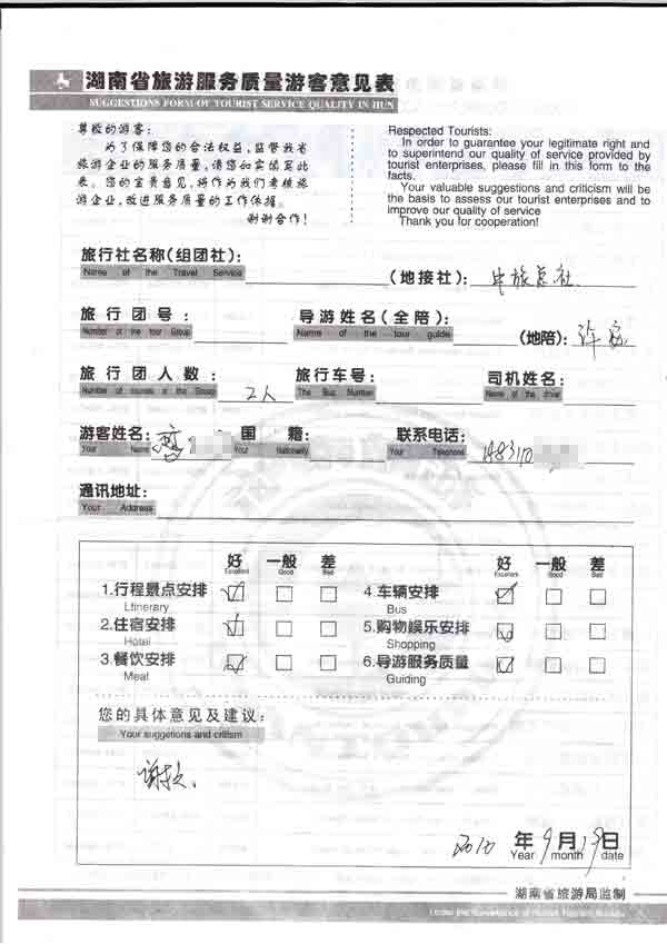 2010年9月19日高先生一行2位旅游質(zhì)量反饋